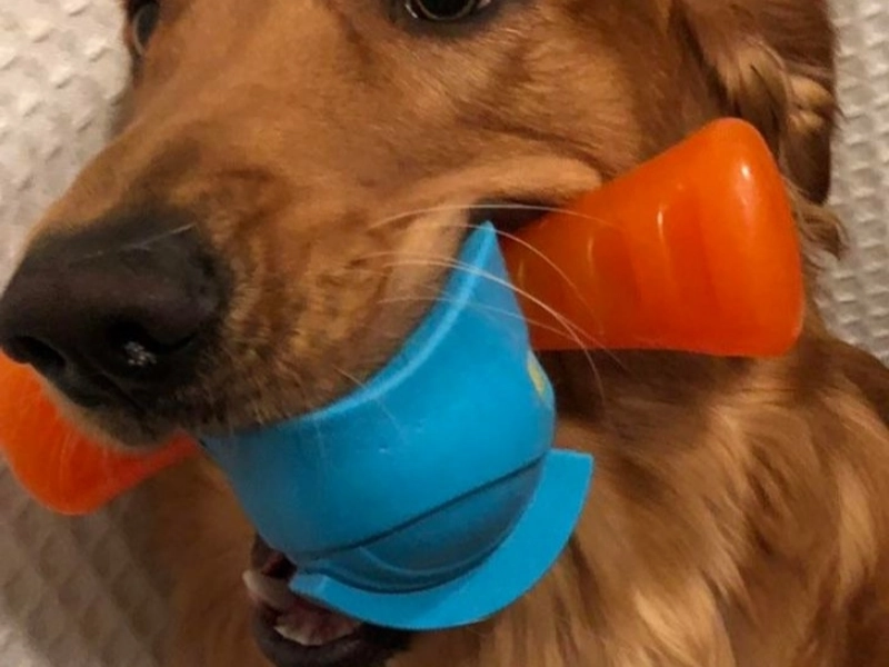 「私の犬がついにやり遂げた!生後11ヶ月で、一度に2つのおもちゃを口に咥えることができたの!私はとても誇らしかった!」
