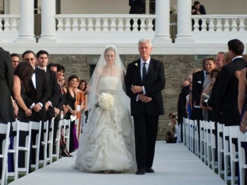 チェルシー・クリントンは2着のヴェラ・ワングのウェディングドレスを着用することで強い印象を与えました。1着目はクラシックなレースが特徴で、2着目は精巧なディテールでモダンな twist を提供しました。両方のガウンが彼女の落ち着きと時代を超えた優雅さへの愛を反映しました。
