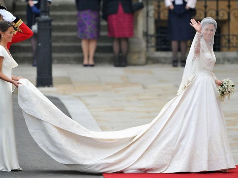 ケイト・ミドルトンのウェディングドレスは、サラ・バートンがアレキサンダー・マックイーンのためにデザインしたもので、レースと職人技の傑作でした。優美なトレインと美しいシルエットがそれを最も記憶に残る王室のガウンの一つにし、世界中の花嫁たちにインスピレーションを与えています。