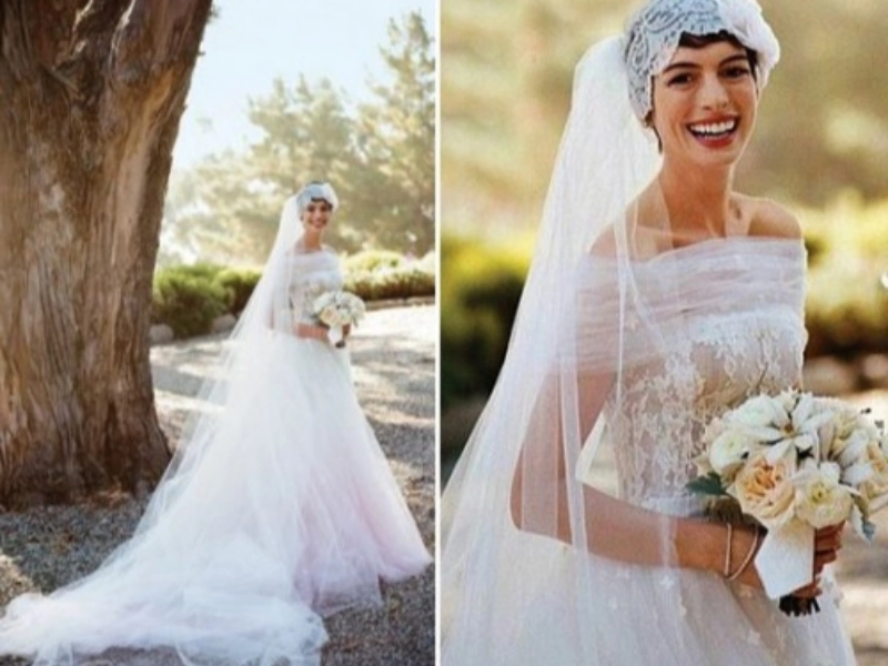 アン・ハサウェイは結婚式にヴァレンティノのガウンを選び、ロマンスと女性らしさを放ちました。柔らかなピンクのトレインとレースのベールが夢のようなタッチを加え、繊細なディテールが彼女の洗練された趣味と時代を超えた優雅さを披露しました。
