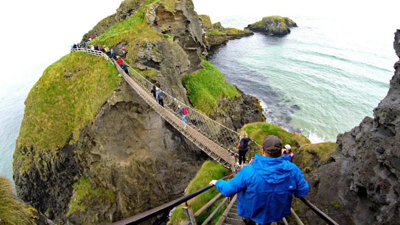 2つの険しい崖の間に吊るされたキャリックアレッドロープブリッジは、下の砕ける波の上100フィートに広がります。この狭く揺れる橋を渡ることは心臓がドキドキする体験であり、特に下を見下ろして古代の洞窟や岩の露頭を見つける勇気のある人にとってそうです。景色は忘れられませんが、露出の感覚は現実です。