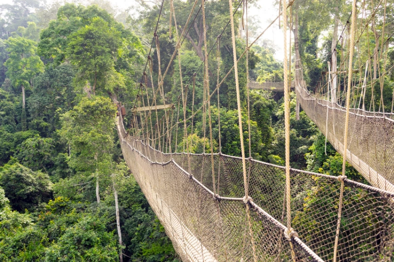 ガーナのカクム国立公園のキャノピーウォークは、アフリカでそのような歩道の三つのうちの一つです。7つの樹冠にわたって、この吊り橋は訪問者に熱帯雨林を上から探索することを可能にし、野生生物と下の緑豊かな生態系を観察するユニークな見晴台を提供します。