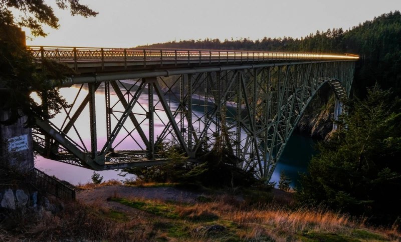 霧と神秘に包まれたディセプションパス橋は、ワシントン州のウィドベイ島とフィダルゴ島を結びます。しばしば霧に包まれるため、数フィート先を見ることさえほぼ不可能にすることがあります。下の渦巻く水と急な落下はサスペンスの感覚を加え、すべての渡橋を未知への冒険にします。