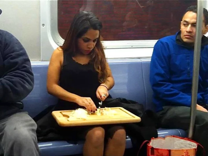 家に着くまで夕食を待つ必要はあるでしょうか?この resourceful な乗客は電車内で食事の準備を始め、野菜を切ったり材料を組み合わせたりしました。