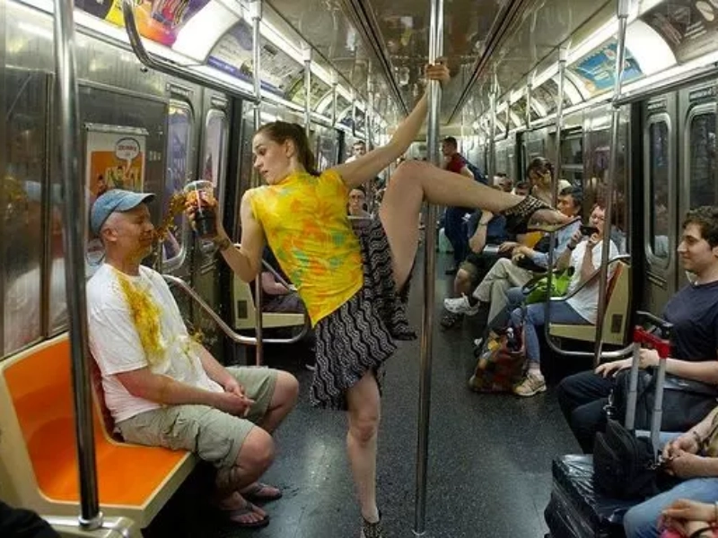 時折、地下鉄は即興のダンスフロアに変わります。この大胆な乗客は瞬間を捉え、風格と自信を持ってポールの周りを旋回しました。