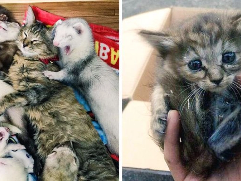 小さな野良猫のコマリは弱々しく不安な状態で到着しましたが、すぐに5匹の活発な雄フェレットの一団に包まれ、優しい好奇心を持って扱われました。彼らの遊び心のあるトンネル追いかけっこや共同の昼寝は彼女の社交学校となりました。自分をイタチ科の兄弟の一員だと思い込み、彼女は彼らの悪戯を真似た後、それらを独特の猫の優雅さと融合させました。今でも成長して自信を持った彼女は、午後の昼寝に彼らの温かい集団を求めており、家族は生物学ではなく愛情によって形成され得ることを証明しています。
