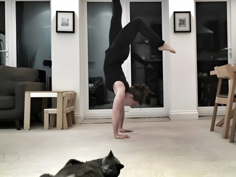 この猫はダウンドッグのポーズをとっています!飼い主がヨガをしている間、猫は自分自身の動きを披露しています。人間は猫を恥ずかしがらせているかもしれません、猫はヨガをしたことがないように見えます。それでも、試みることが最も重要です。怠惰な猫でも練習すれば上達できます。