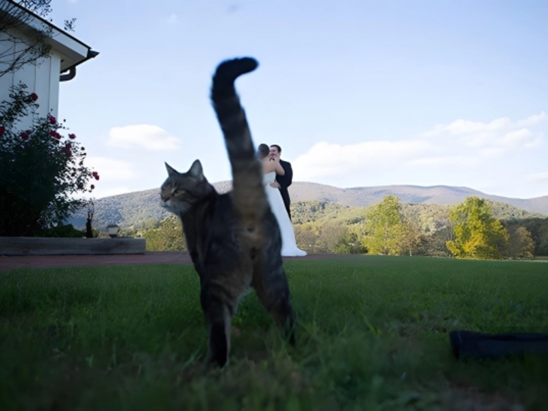 おっと!この写真は少し cheeky(図々しい/お尻が写っている)です。猫は信頼できる人間にお尻を自慢するのが好きです。ここでは、猫が結婚式について何か主張しているように見えます。もしかすると、新婚夫婦にこれから起こることをほのめかしているのかもしれません。これこそ、私たちが猫を愛する理由です—彼らの大胆さがすべての瞬間を記憶に残るものにしてくれます。