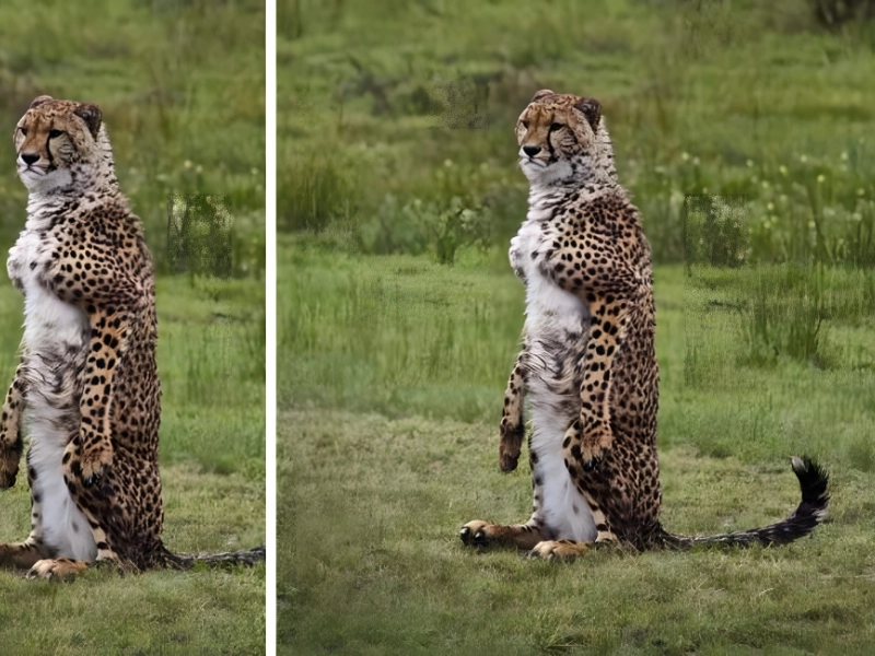 背筋を伸ばして立つチーターの魅力的な写真は、ソニーA1のような高性能野生動物カメラで撮影されたのでしょう。鋭い感覚を持つチーターは常に警戒しており、この個体は何かに気づき、必要なら即座に走り出す準備ができているようです。