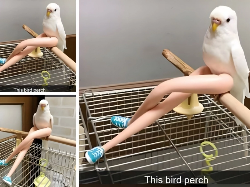 バービー人形の足が取り付けられた枝に止まるこの鳥は、可笑しい錯覚を作り出しています。鳥は冗談に気づいていないようで、場面をさらに面白くしています。