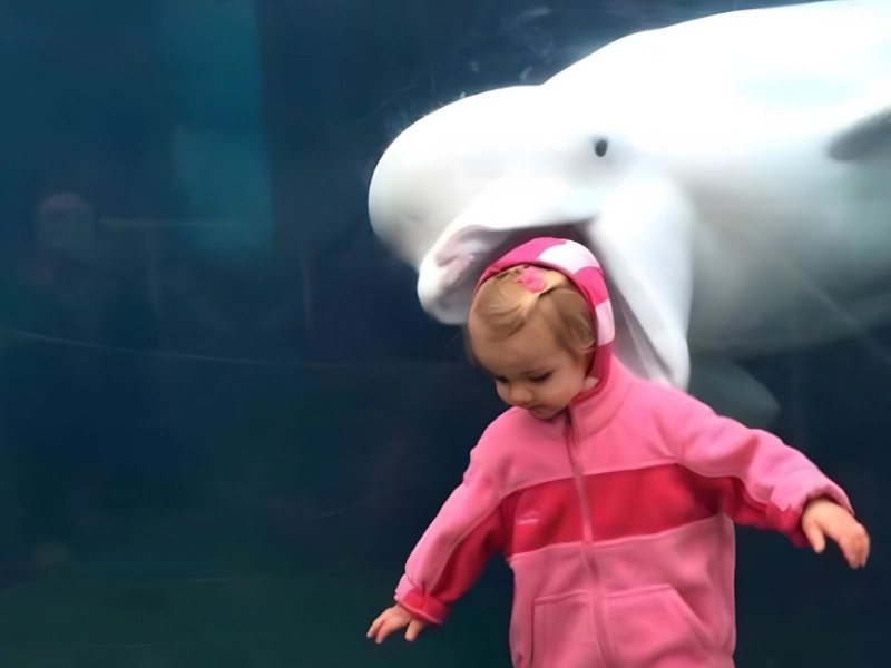 このイルカはおやつの準備ができているようで、子供は幸せなことに気づいていません。幸い、厚いガラスが彼らを隔てています。