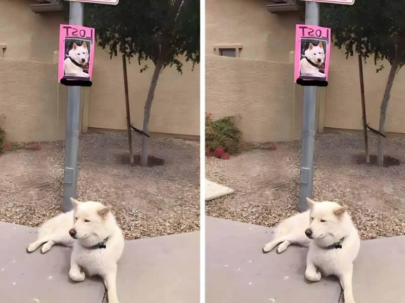 このふわふわの犬は迷子ではありません。ただ家に帰りたくないだけなのです。自分自身の「迷子」ポスターの下でくつろぎ、まったく気にしていないように見えます。