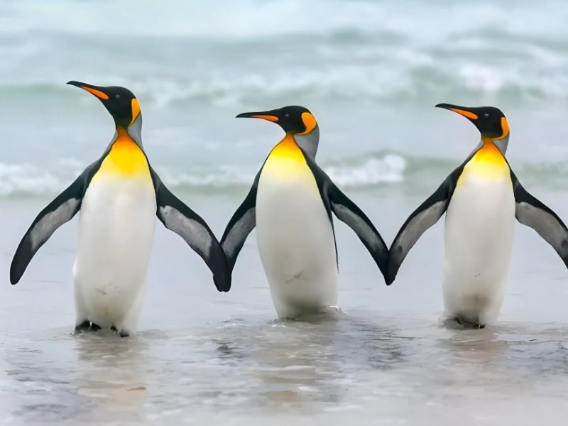 この甘い画像は、ビーチ沿いを歩き、互いの翼を持ち合う3羽のキングペンギンを示しています。それは動物と人間の関係の類似性を強調し、2023年コメディ野生生物コレクションに選ばれました。