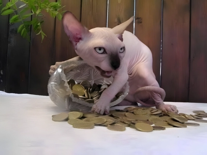 この画像には説明が必要です。なぜこの猫は硬貨を集めているのでしょうか?本物のお金?それともゲームセンターのトークン?そしてなぜ毛がないのでしょうか?真の疑問は、あなたなら硬貨を取ろうとしますか?それともただ離れますか? この光景は、毛のないスフィンクス猫を首謀者とする風変わりな強盗映画の一場面のようです。硬貨の上での猫の強烈な視線と守るような姿勢が、奇妙ながらも面白い画像を作り出しています。そのしわくちゃの皮膚と毛のなさがドラマを一層盛り上げ、神話的な宝の守護者のように見せています。多くの疑問が湧き起こります:この猫は長い間硬貨をため込んでいたのか?どこで手に入れたのか?これは一種の猫の貯金口座なのか?猫の姿勢は戦利品を守る準備ができていることを示唆しており、猫がその風変わりな習慣とお金の価値のような人間の概念をどうやら理解していることで、私たちを驚かせ続けることを思い出させます。