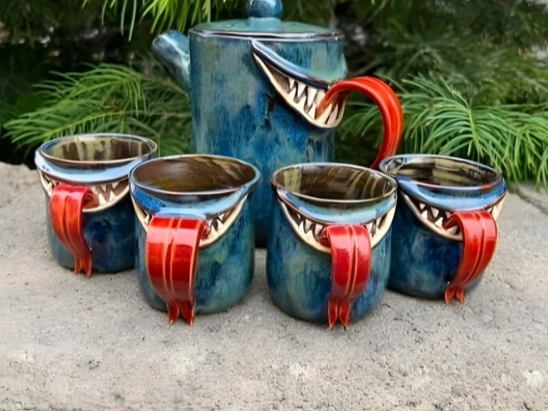 Dieses wahrlich ungewöhnliche Teeservice erweitert die Keramikgestaltung in angenehm verstörendes Terrain. Von den schockierend langen Zungen bis zu den bedrohlich spitzen Zähnen an den Trinkrändern weist jedes Stück der Kollektion akribisch gestaltete, schaurige Details auf. Die kreative Ausführung ist erstaunlich; jedes Grimassen und Knurren im gebrannten Ton ist präzise eingefangen. Diese Werke sind nicht nur um des Schocks willen erschreckend; sie untergraben auch geschickt die konventionellen Erwartungen an ein Teeservice und verwandeln eine üblicherweise kultivierte Freizeitbeschäftigung in etwas Abenteuerlicheres. Besonders einzigartig und gesprächswürdig machen sie das interessante Paradox, das durch die Gegenüberstellung der polierten Tätigkeit des Teetrinkens mit dem Horror-inspirierten Design entsteht.