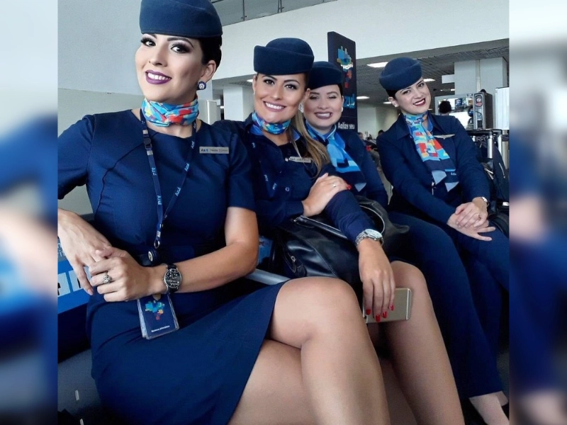 Charming flight attendants await their next adventure. This photograph likely shows a group of elegant flight attendants at the airport, perhaps in a departure lounge or near a gate. Dressed in crisp uniforms with stylish accents like scarves or hats, they exude professionalism and poise. The image may capture them in a relaxed moment before boarding, revealing a more personal side. Their expressions range from friendly smiles to casual conversations, showing the camaraderie among the crew. The background features typical airport scenes with passengers, departure boards, or planes visible through large windows. This image makes flight attendants relatable, reminding viewers that behind the uniforms are individuals with their own unique stories. It also highlights the teamwork and friendship essential in their profession. Their appeal is defined as much by their warmth and approachability as by their appearance.