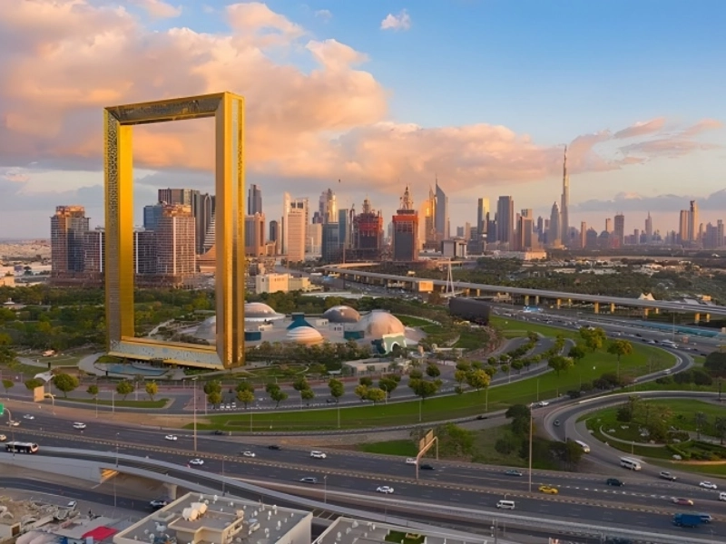 Cet immense cadre photo de 150 mètres de haut offre des vues panoramiques à couper le souffle sur le passé et le présent de Dubaï. Le coût de sa construction s'est élevé à la somme astronomique de 43,5 millions de dollars. Le Dubai Frame est une œuvre architecturale qui s'assemble en un cadre géant pour présenter des vues de la ville. Le cadre photo doré recouvert de miroir, mesurant 150 mètres de haut et 70 mètres de large, offre des vues expansives qui s'étendent de la nouvelle skyline étincelante aux monuments emblématiques du vieux Dubaï.