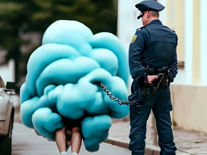 Crédit à Pleated JeansApp. Midjourney a été utilisé. Tout le monde a déjà senti un pet si horrible que son auteur mériterait d'être emprisonné. Midjourney a porté cette idée à un niveau supérieur. Cela montre un policier appréhendant un suspect plutôt particulier.