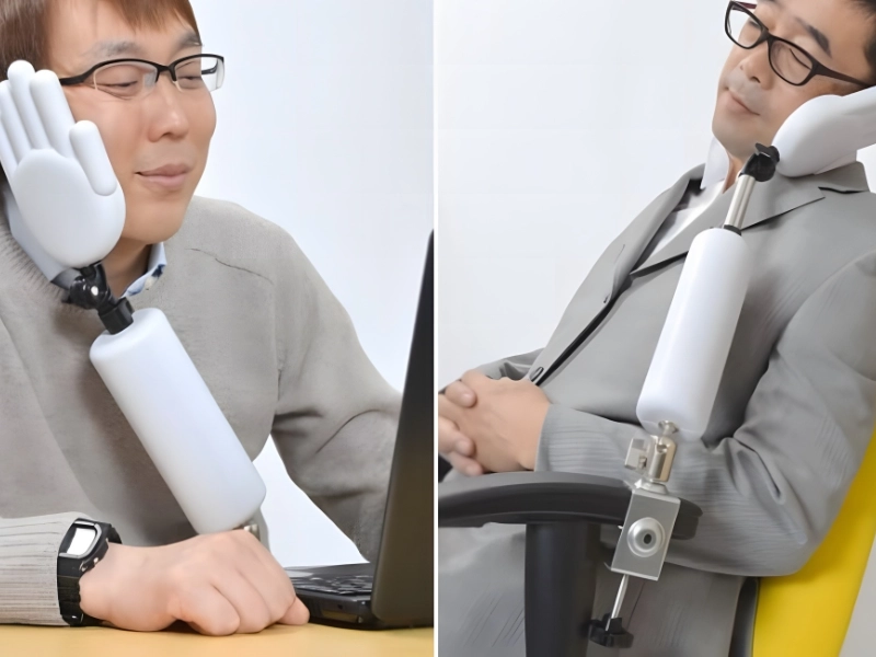 De quoi s'agit-il ? Un repose-tête en forme de main, à fixer sur un bureau, pour faire des siestes. Inventé en : 2015 Prix moyen : environ 40 $. Cette création étrange semble trouver son public, malgré son apparence quelque peu déconcertante. Grâce à ce support crânien en forme de main qui se fixe au bureau et s'ajuste, vous pouvez faire une sieste au travail si vous le souhaitez. Il fonctionne un peu comme une troisième main en uréthane.