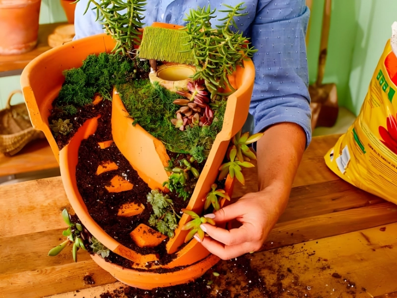 Même si un pot en terre cuite cassé peut sembler être un déchet, avec un peu d'imagination, il peut être transformé en un charmant jardin de fées. Ces petits jardins adorables apportent une touche fantaisiste et charmante à n'importe quel espace de jardin. Tout d'abord, prenez un pot cassé (ou cassez-en un volontairement, en toute sécurité bien sûr) et ajoutez-y de la terre. Disposez les morceaux cassés dans le pot de manière à créer de petits escaliers ou terrasses. Ensuite, ajoutez de petites décorations comme un petit chalet, un petit banc ou des figurines, et plantez une variété de petites plantes comme des succulentes ou de la mousse.