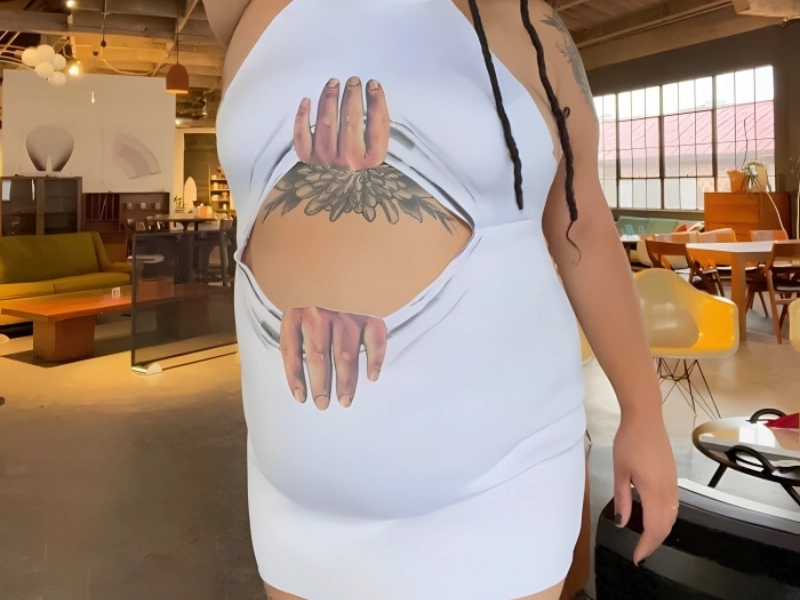 Oh mon Dieu, ce vêtement nous fait ressentir beaucoup de choses que nous préférerions ne pas ressentir. Bien que ce ne soit pas de manière émotive et excitante, il nous donne la chair de poule dans un sens de terreur cosmique ; nous avons peur d'une manière inexplicable. Le design semble remettre en question non seulement la mode établie, mais aussi notre conception fondamentale de ce que les vêtements devraient être. Le placement délibéré des découpes – ou plutôt, leur mauvais placement – crée un impact visuel inconfortable difficile à ignorer. Nous ne savons pas très bien qui est le plus responsable ici : la personne qui a créé ce vêtement ou celle qui l'a volontairement porté. Dans tous les cas, nous ne souhaitons qu'aucune des deux ne le répète. Les choix de tissus et les décisions structurelles pris ensemble semblent défier à la fois la logique et l'esthétique dans des proportions égales. Lorsque vous avez un tatouage un peu bizarre exactement à l'endroit du trou dans votre vêtement, c'est aussi une option vestimentaire fascinante. On se retrouve à vouloir centrer le tatouage. Il y a un terrible déséquilibre. Le placement du tatouage ajoute une couche d'énergie frénétique supplémentaire à une tenue déjà déroutante, comme si la robe était spécialement conçue pour générer un maximum d'ambiguïté visuelle. Moins de haute couture et plus de haute confusion, c'est le résultat global de cette combinaison, qui provoque chez les spectateurs un grand malaise difficile à chasser.