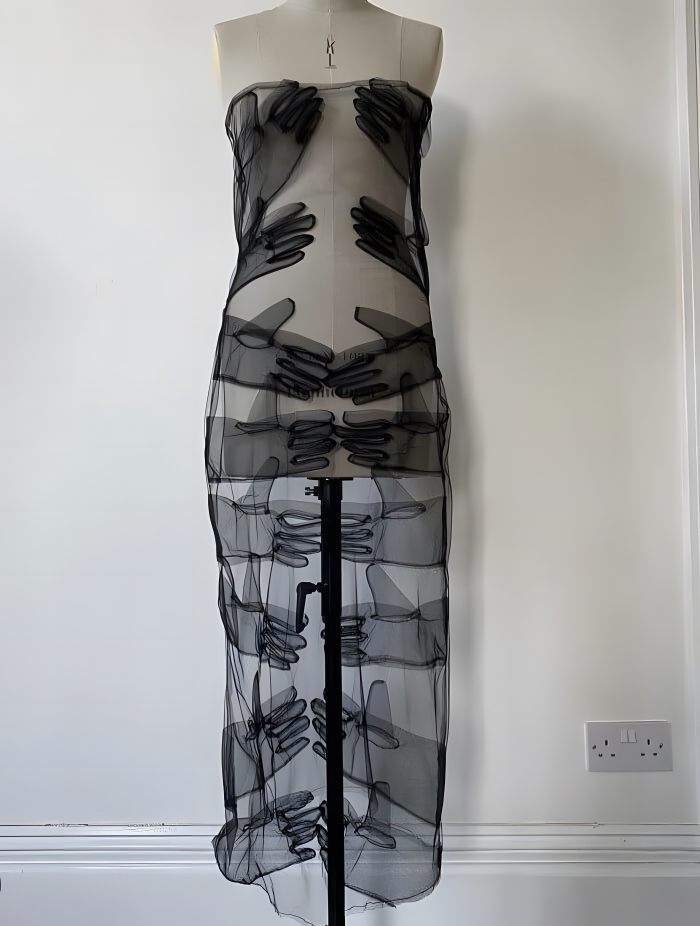 Voici l'une de ces robes qui ressemble davantage à un projet artistique qu'à un véritable vêtement que quelqu'un porterait. L'idée elle-même soulève plusieurs questions sur le confort, l'utilité et le but fondamental du vêtement. Nous croyons qu'une grande partie des vêtements protège notre peau nue de la saleté, des animaux sauvages et du monde extérieur en général. Porter un vêtement rempli de mains qui palpent pourrait donc être un peu contre-productif. Cela semble simplement aller à l'encontre de la fonction des vêtements. S'il y a une déclaration artistique, elle disparaît dans la gêne même de la présentation visuelle. Habituellement destinées à être provocatrices ou à susciter la réflexion, les mains produisent un impact inconfortable difficile à concilier avec le port de la mode. À l'inverse, peut-être s'agit-il d'une œuvre d'art percutante destinée à défier notre sagesse conventionnelle et à nous inciter à réfléchir à la fonction des vêtements. Encore une fois, peut-être que non. Avec des œuvres comme celles-ci, la distinction entre la mode avant-gardiste et l'art performance devient plus floue et nous commençons à nous demander si certaines idées appartiennent au domaine de l'art conceptuel plutôt que d'être transformées en objets portables.