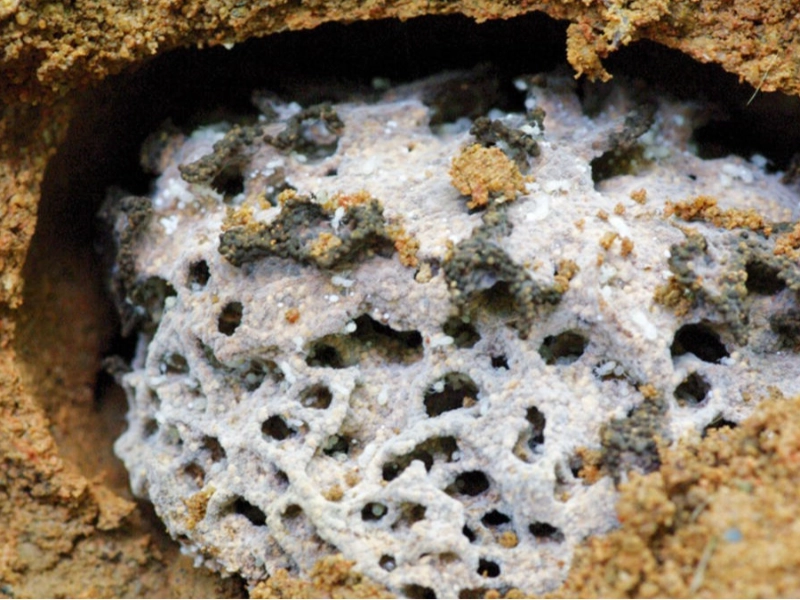 Certaines espèces de termites cultivent d'ingénieux jardins fongiques au cœur de leurs termitières. Ces insectes laborieux entretiennent des espèces spécifiques de champignons Termitomyces, établissant ainsi un système agricial des millions d'années avant l'apparition de l'agriculture humaine. Alors que le champignon décompose la cellulose complexe en nutriments digestibles pour les termites, ces derniers fournissent la matière végétale nécessaire à son alimentation. Cette coopération étonnante a atteint un tel degré de spécificité qu'aucune des deux espèces ne pourrait exister sans l'autre. Afin d'offrir des conditions de développement idéales à leurs partenaires fongiques, les termites régulent méticuleusement la température et l'humidité à l'intérieur de leurs monticules ; en retour, le champignon produit des structures spécialisées appelées nodules, qui constituent la principale source de nourriture de la colonie. L'une des illustrations les plus complexes d'élevage par les insectes dans la nature, cette relation est si parfaite que les termites ont évolué pour développer des chambres spécialisées dans leurs nids, dédiées exclusivement à la croissance fongique.