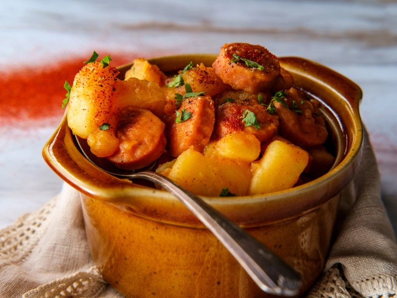 Paprikás Krumpli : un plat hongrois classique de pommes de terre mijotées avec de la viande et des légumes.