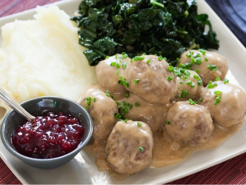 Boulettes de viande à la confiture d'airelles : Un plat suédois classique servi avec une salade et de la purée de pommes de terre.