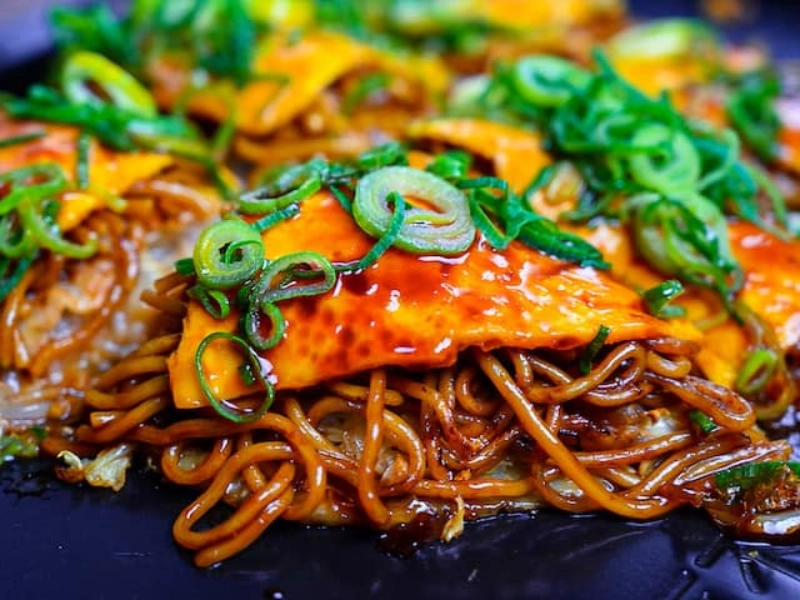 Okonomiyaki style Hiroshima : un mélange de nouilles, de chou, de soba, d'œufs, d'épices et d'une sauce unique, le tout intégré dans une sorte de pancake.