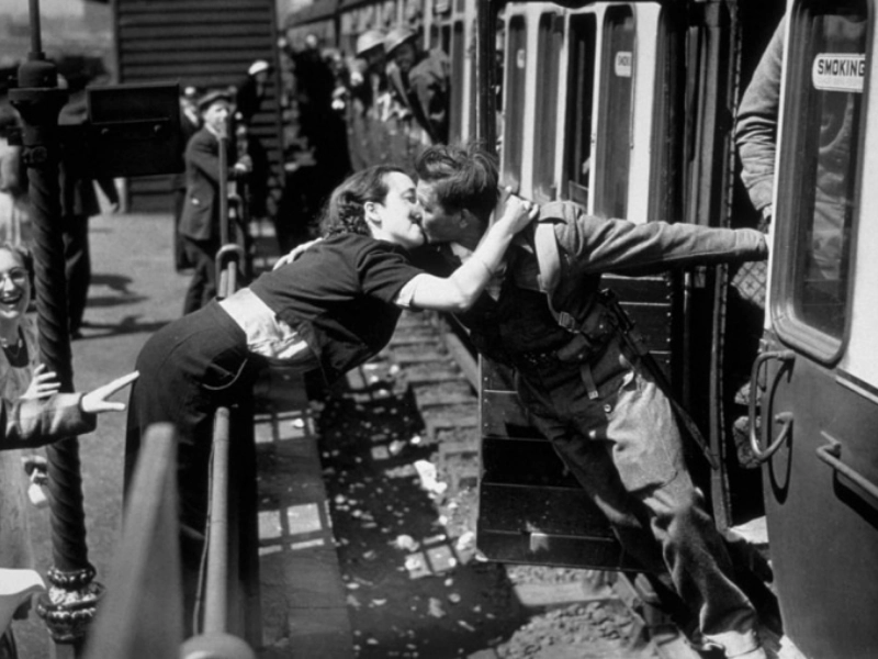 Un baiser passionné dans la gare de Londres en 1945.