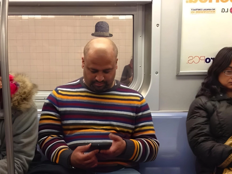 Appareil photo potentiel : Google Pixel 7 Où acheter : Best Buy Prix moyen : 499 $* Voici une autre photo parfaitement cadrée qui donne l'impression que le passager porte un petit chapeau. L'homme à côté de lui remarque que quelqu'un prend une photo rapide dans le métro, mais le passager concerné ne semble pas s'en rendre compte. Il doit probablement se demander ce que fait le photographe.