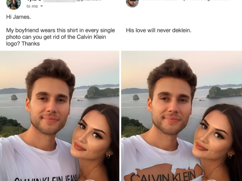Une femme, agacée que son petit ami porte le même t-shirt sur toutes leurs photos, a envoyé ce cliché. Et, avouons-le, qui pourrait lui en vouloir ? Tout le monde a ce t-shirt fétiche qu'il porte en permanence. Elle souhaitait néanmoins que le logo Calvin Klein disparaisse du vêtement. La photo retouchée montre le jeune homme privé de son t-shirt préféré, mais arborant fièrement un tatouage à l'effigie de la marque.