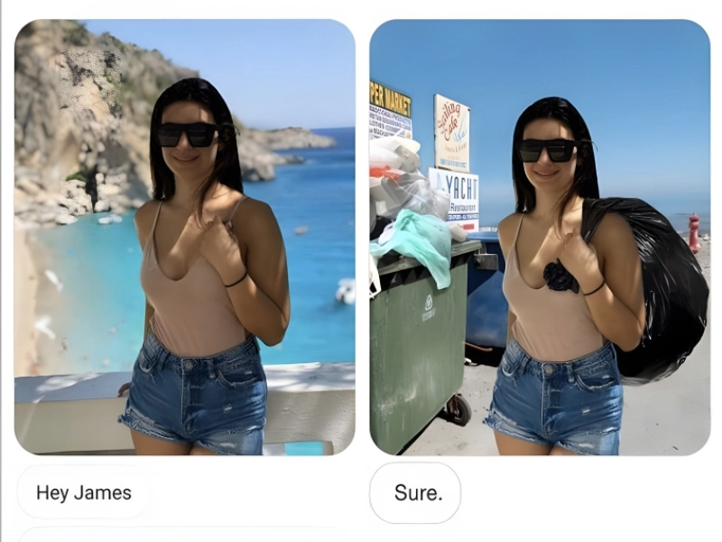 Voici une technique pour gâcher une photo qui semblait parfaite. Elle a demandé à être vue portant un sac sur l'épaule gauche, mais elle a omis de préciser le type de sac. Ce fut une erreur, car elle s'est retrouvée photoshopée en train de tenir un sac poubelle. Pour couronner le tout, la plage a été équipée de poubelles et de panneaux pour mieux l'intégrer au reste de l'image.