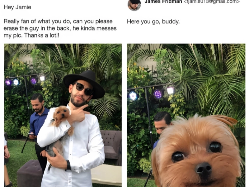 Personne ne pourra le contester : c'est sans doute le meilleur travail de Photoshop de cette page. Nous sommes ravis que le gars à l'arrière ait été supprimé, car sans cela, nous n'aurions jamais eu ce petit bijou sur l'image de droite. La demande était : "Je suis vraiment fan de votre travail, pouvez-vous effacer le gars à l'arrière, il gâche un peu ma photo."
