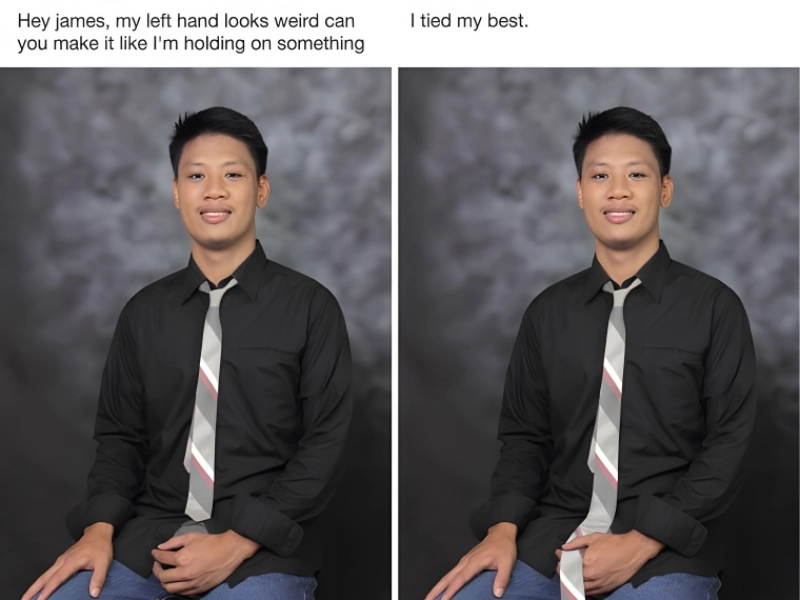 Quoi de plus gênant que la main de ce jeune homme sur la photo de gauche ? Eh bien, la voici, isolée sur la droite. Il avait simplement demandé que sa main gauche tienne quelque chose pour paraître moins bizarre. Même si le résultat n'est pas beaucoup moins étrange, elle tient bel et bien un objet sur l'image de droite. Maintenant, il est difficile de détourner le regard. Avec la première photo, on avait peut-être une chance de ne pas la remarquer.