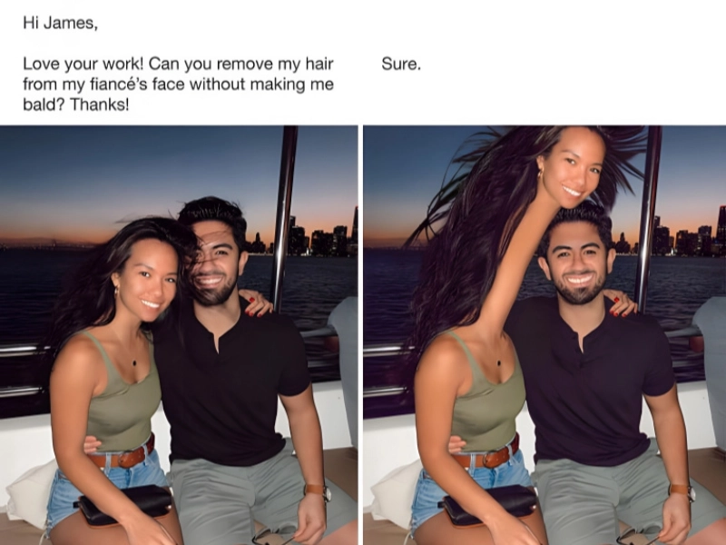 C'est une demande plutôt attentionnée. La petite amie sur cette photo a fait remarquer que ses cheveux cachaient le visage de son fiancé. Elle a donc simplement demandé à ce que quelques mèches soient retirées pour qu'on la voie clairement. Résultat : elle s'est retrouvée avec un cou étrangement et disproportionnément petit. L'effet est le même, certes, mais cela a dû demander bien plus d'efforts que de simplement effacer quelques cheveux.