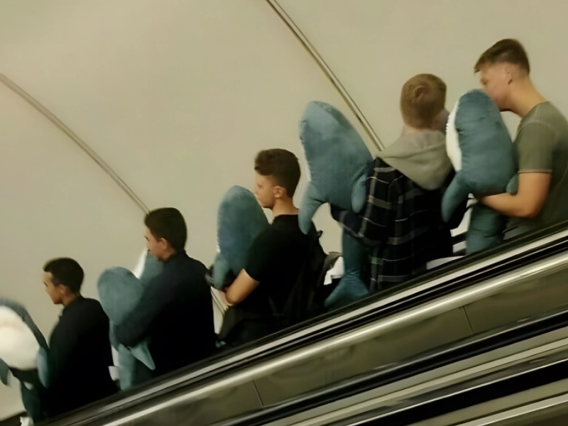 Cinq personnes sont représentées dans cette scène moscovite merveilleusement synchronisée descendant un escalator, chacune tenant son propre Blahaj, le désormais iconique requin en peluche IKEA qui est passé d'un simple jouet pour enfants à une folie en ligne. L'image montre une jonction parfaite entre la culture commerciale, l'évolution des mèmes en ligne et l'engagement communautaire – un moment qui semblerait étrange sans contexte. Le Blahaj a acquis sa propre pertinence culturelle et sa propre communauté, transcendant le statut de simple peluche.